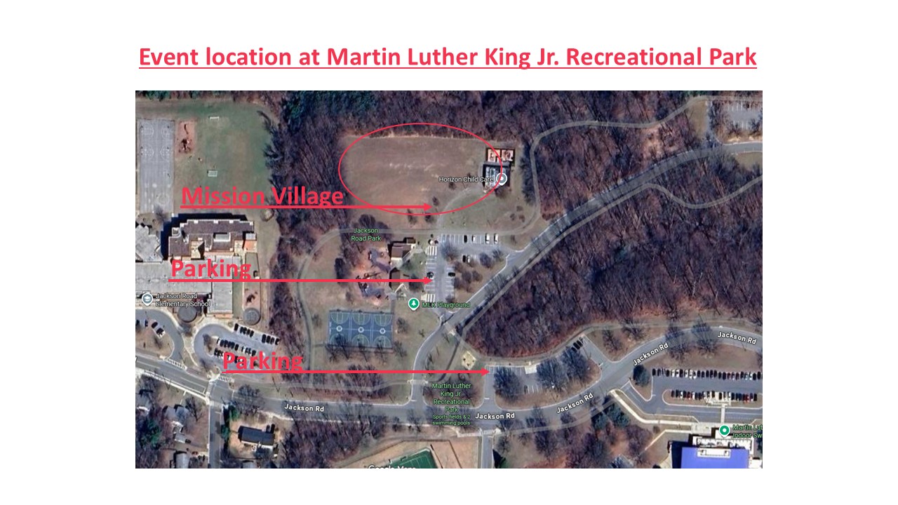Martin Luther King Jr. Recreational Park’s address is 1050 Jackson Road, Silver Spring, MD 20904. There is a parking lot next to the playground/restrooms, and our Mission Village will be set up just north of that. Look for our tent setup! If that parking lot is full, there are other lots throughout the park. Parking is free!